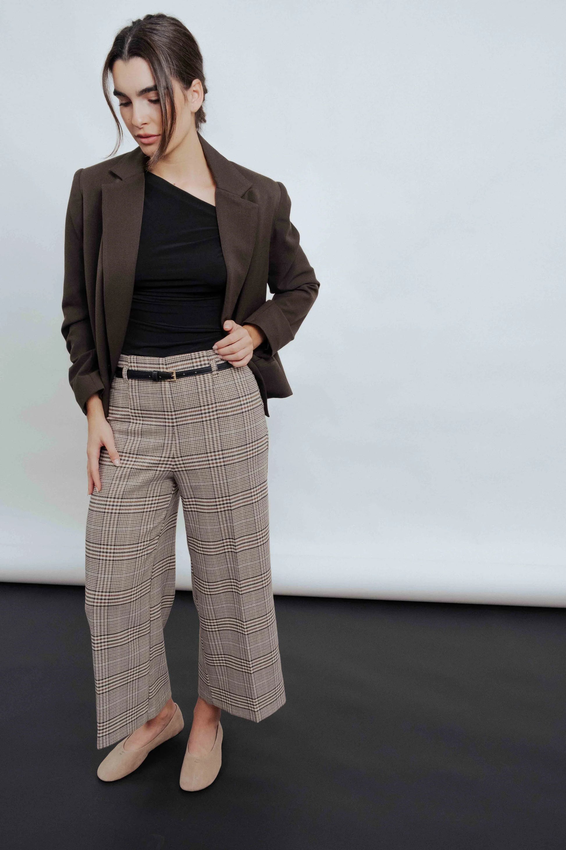 Calça culotte de cintura média. Cinto ajustável com fivela de metal. Perna larga. Fecho lateral com zíper oculto na costura.