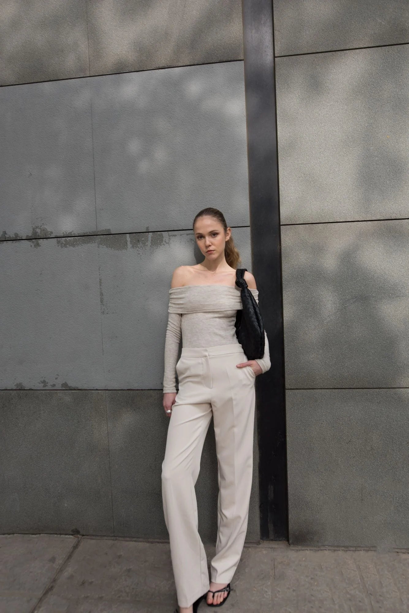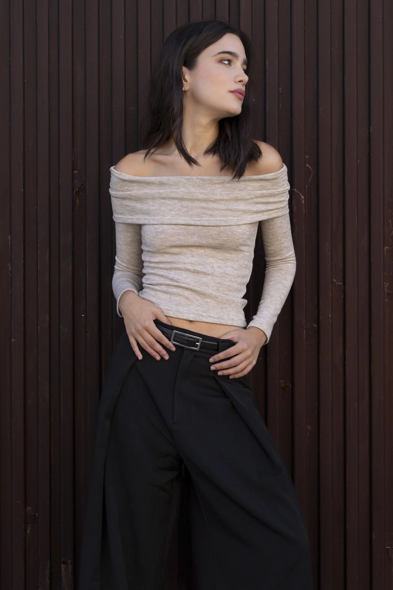 Camisola com ombros descobertos de tato suave e corte direito justo.