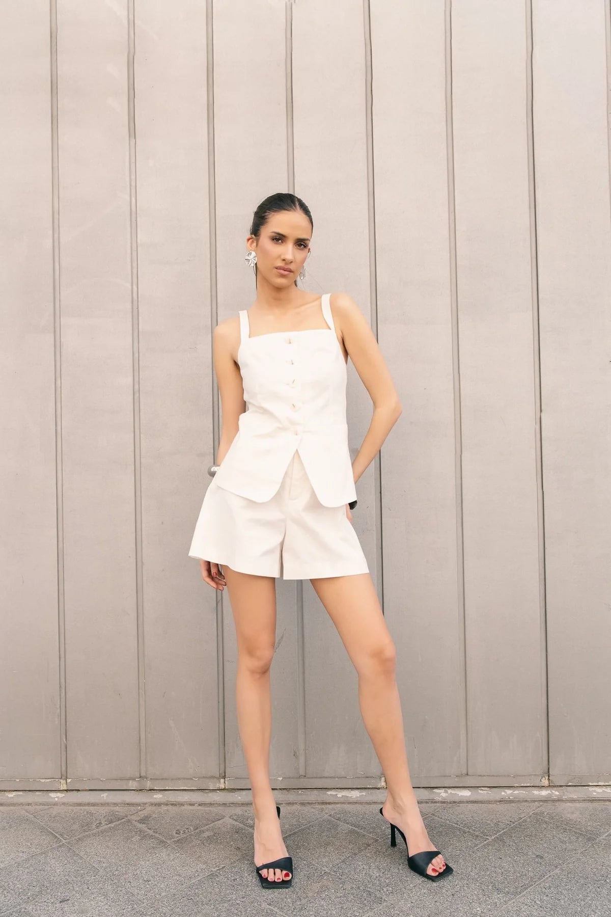 Colete fluido regular com decote quadrado e manga cava. Fecho com botões.